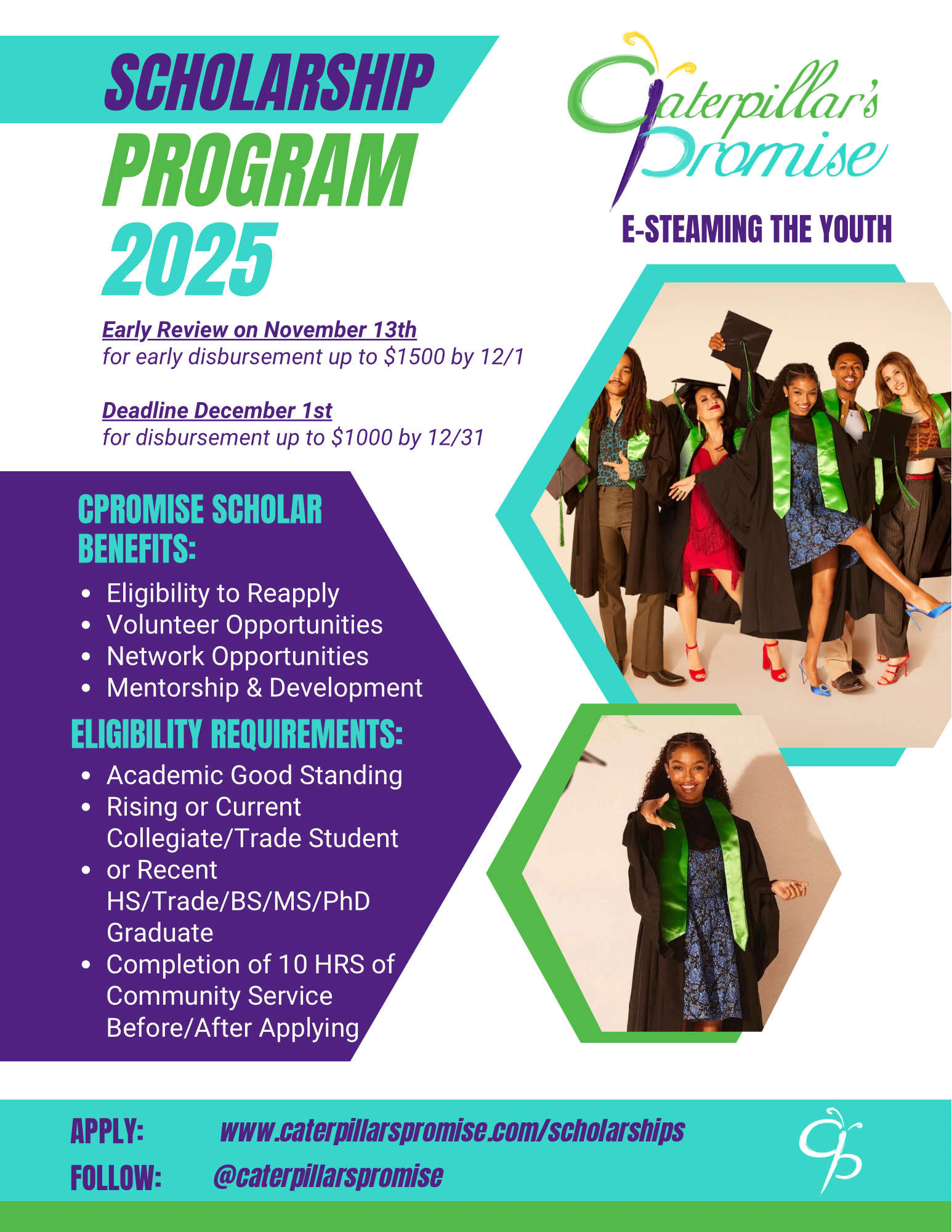 Current CPromise Scholarship Programs include the: Caterpillar’s Promise Scholarship, E-STEAM Mentee Scholarship, E-STEAM for Good Scholarship Challenge, and Tutoring & ACT/SAT Prep Scholarships. Applications are rolling based on the scholarship funding pool. See below for upcoming or current applications and forms:
